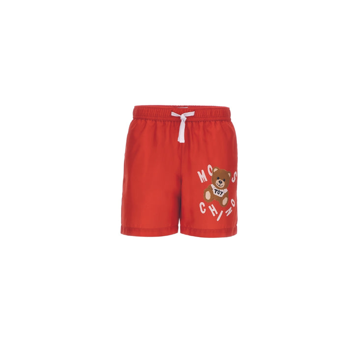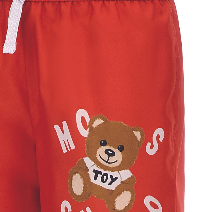 Bright red swim shorts for boys by Moschino Kid-Teen. Silky and lightweight, they have the brands Moschino Teddy Bear printed on one leg with a white logo print. They have a lightweight mesh lining for comfort, useful side seam pockets and a comforta