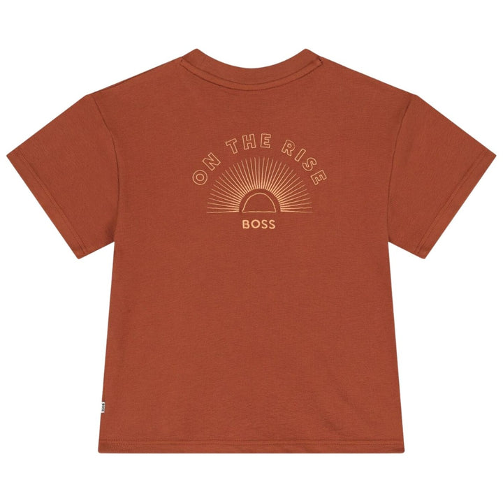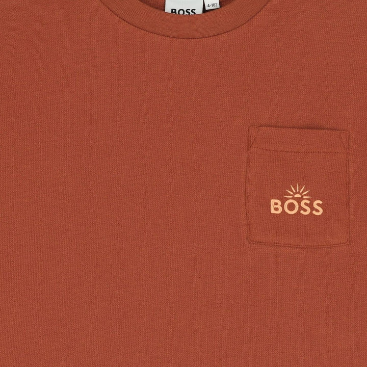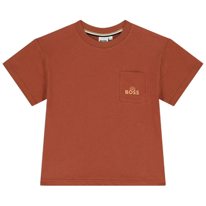 Rust brown t-shirt for boys by BOSS. Made from soft cotton jersey, it features chest pocket with the brands logo embroidered in orange.