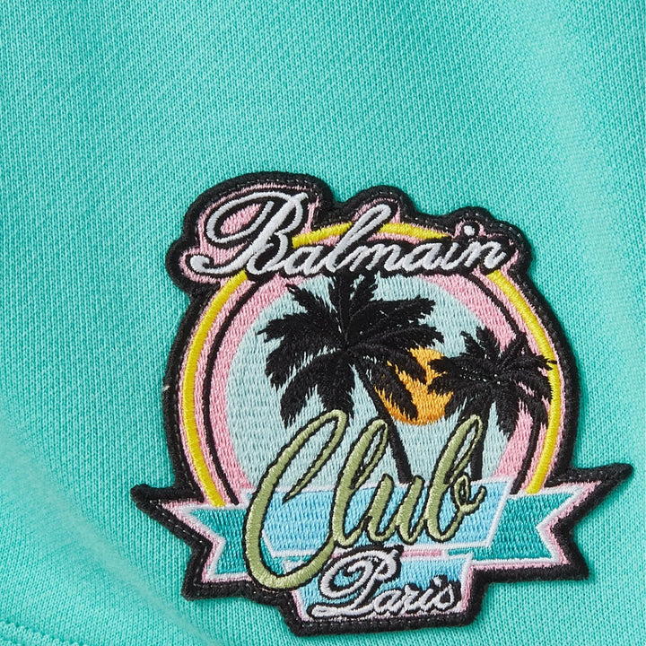 Boy Sea Green shorts with an embroidered logo, elasticated waistband, two side inset pockets, and a rear patch pocket.