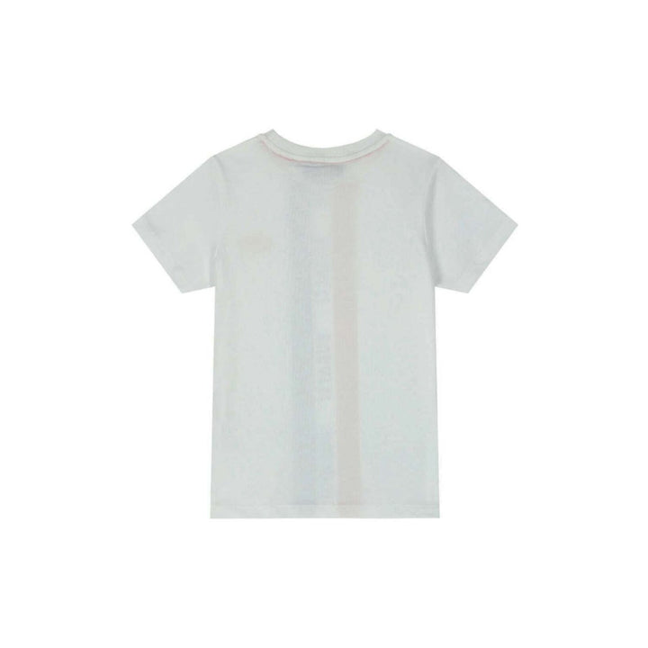 Boys white logo t shirt by Bugatti Kids. Made from soft cotton, it features a signature red and blue striped and the brand logo print on the front. Round neck with half sleeves.