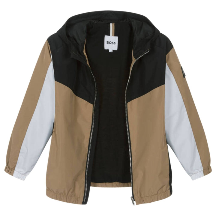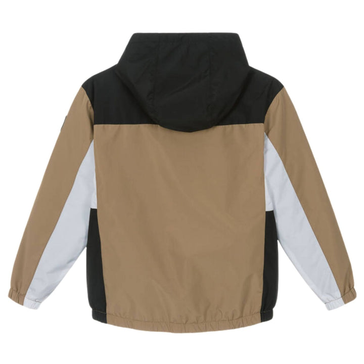 In a beige, black and white colourblock design, this Mini-me windbreaker for boys is by BOSS. Silky smooth and lightweight, it features a water repellent exterior and a soft jersey lining, with a fixed hood and a full front zip fastening. Elasticated