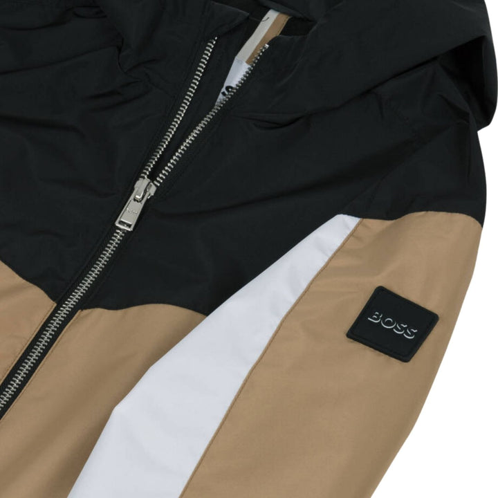 In a beige, black and white colourblock design, this Mini-me windbreaker for boys is by BOSS. Silky smooth and lightweight, it features a water repellent exterior and a soft jersey lining, with a fixed hood and a full front zip fastening. Elasticated cuffs and hem provide a snug fit and a rubberised logo patch on the sleeve adds a finishing designer touch.