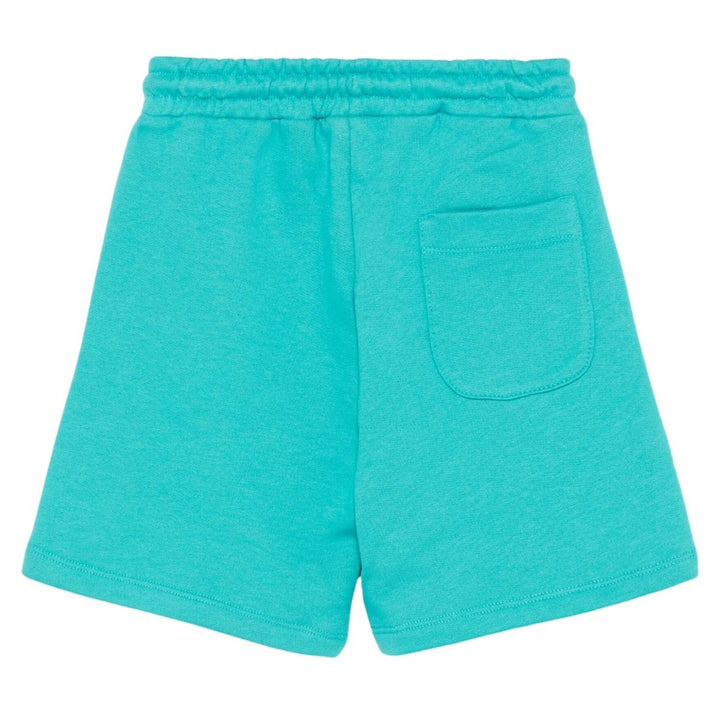 Turquoise blue cotton shorts for boys by MSGM, with a white logo printed on one leg. Made in soft and comfortable jersey, they are casually styled with side seam pockets and a drawstring waistband.
