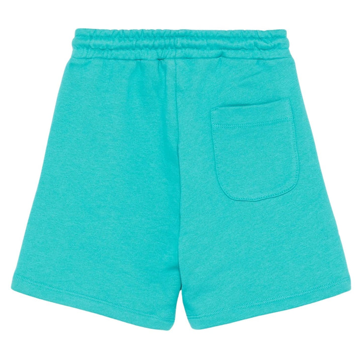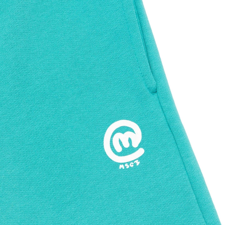 Turquoise blue cotton shorts for boys by MSGM, with a white logo printed on one leg. Made in soft and comfortable jersey, they are casually styled with side seam pockets and a drawstring waistband.