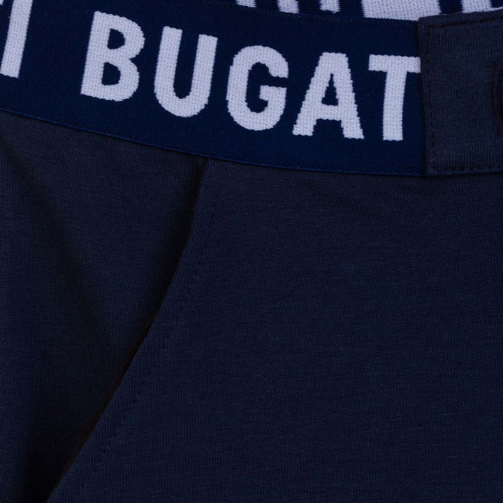 Sporty navy knee‑length shorts featuring an elasticated waistband with bold BUGATTI logo branding and an adjustable drawstring for a secure, comfy fit. Side pockets and a small red Bugatti badge at the hem complete the athletic look, perfect for casual days and active wear.