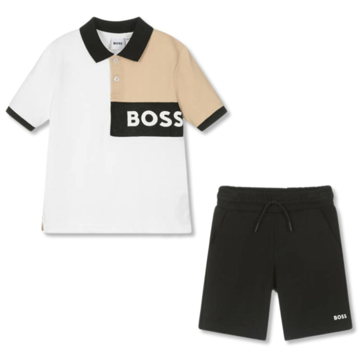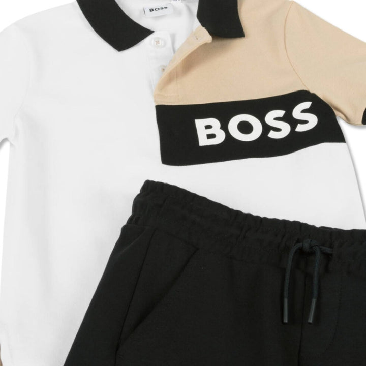 In the brand's distinctive black, beige and white colour palette, this sporty shorts set for boys is by BOSS. The polo shirt is made in soft cotton pique with ribbed trims, and the cotton jersey shorts have useful front pockets and a comfortable elas