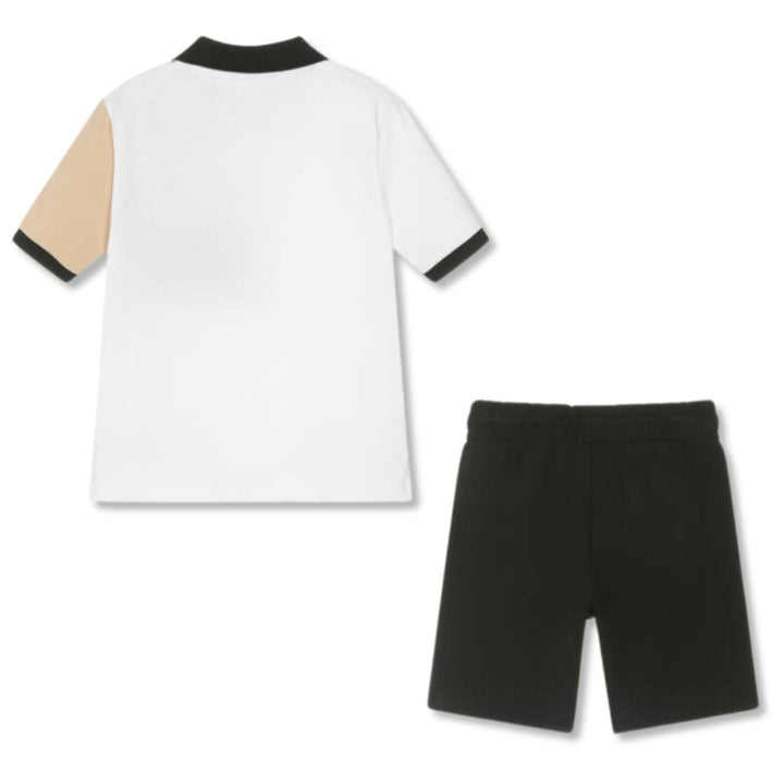 In the brand's distinctive black, beige and white colour palette, this sporty shorts set for boys is by BOSS. The polo shirt is made in soft cotton pique with ribbed trims, and the cotton jersey shorts have useful front pockets and a comfortable elasticated drawstring waist. Both pieces have white logo prints for a signature finish.