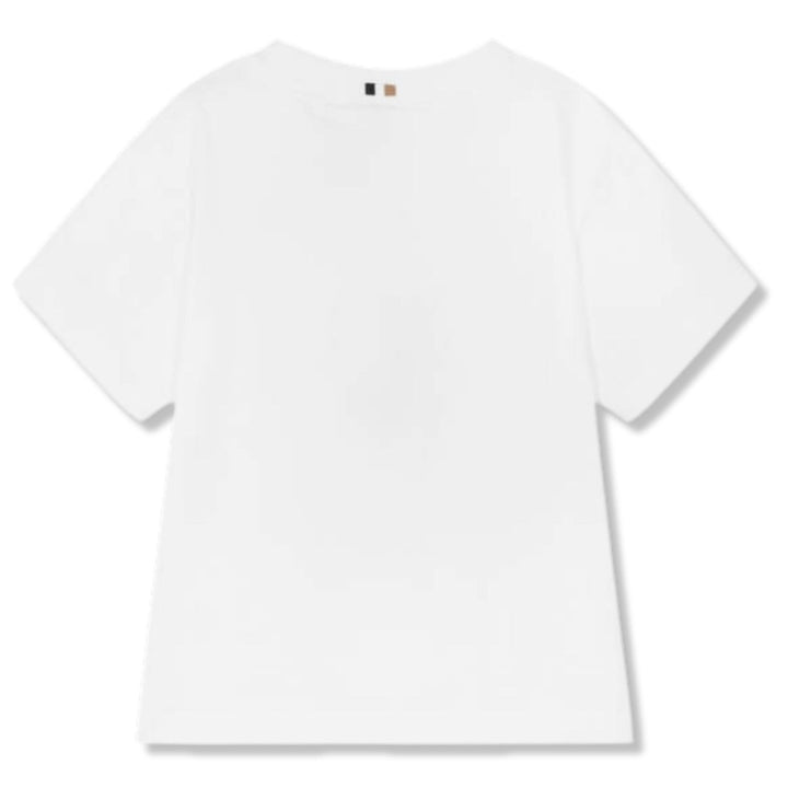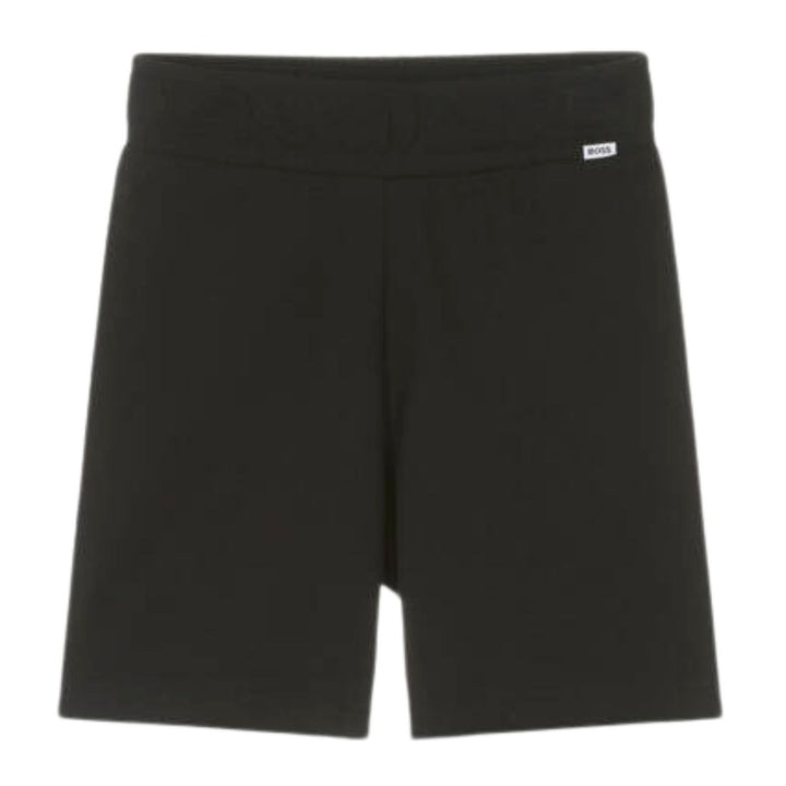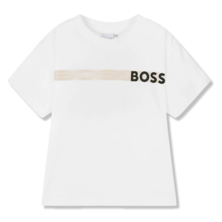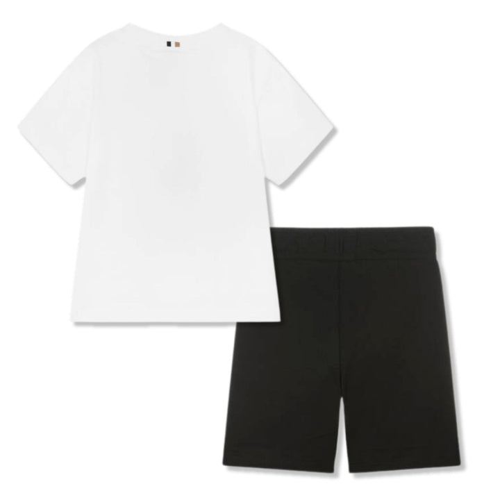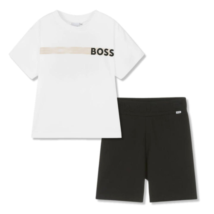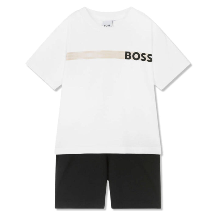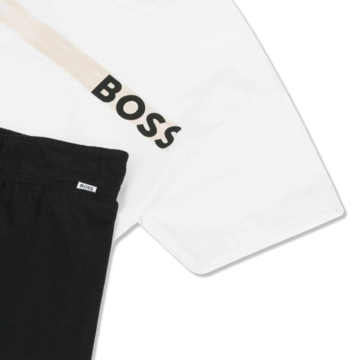 Soft, lightweight and comfortable, this cotton jersey shorts set for boys is by BOSS. The white T-shirt has a painted-look beige stripe printed across the chest with a contrasting black logo, for instant brand recognition. The black shorts have a comfortable, elasticated waistband. The set is easy to wear, simply pulling on.