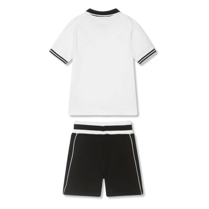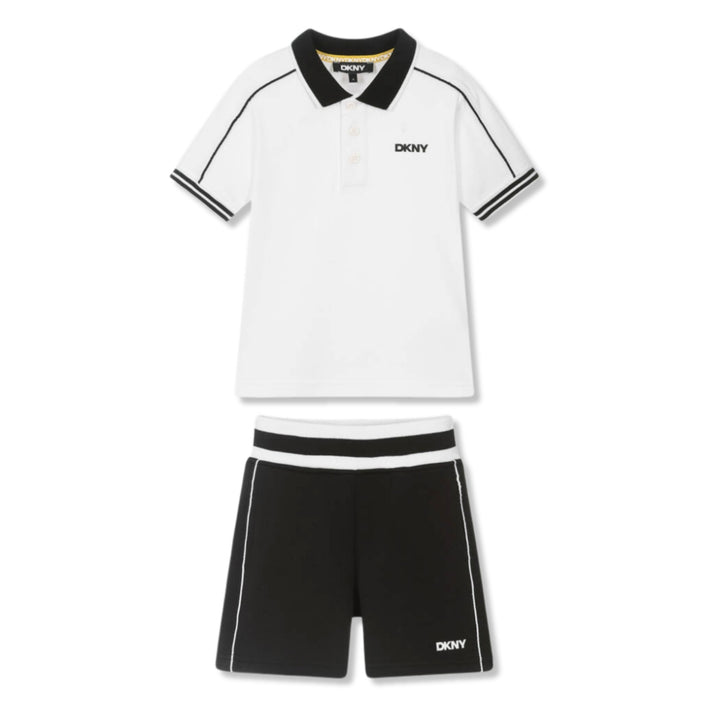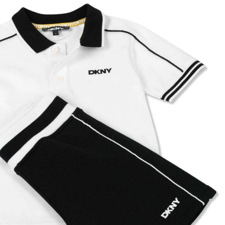 Sporty white and black cotton shorts set for boys by DKNY. The pique top is a classic polo style with a ribbed collar and branded button placket, while the mid-weight jersey shorts have a striped, stretchy waistband and side seam pockets. Both pieces
