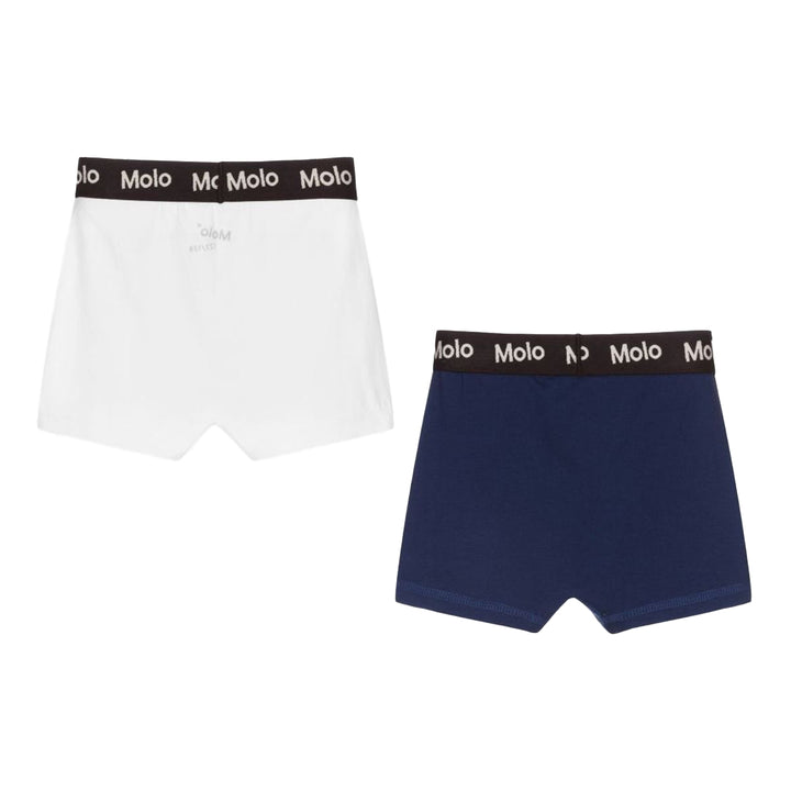 Two pack of white and navy blue boxers for boys, by Molo. Made from soft organic cotton jersey, they have a black and white elasticated logo waistband for comfort.