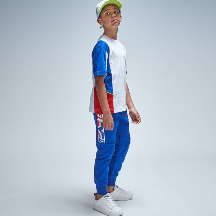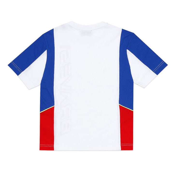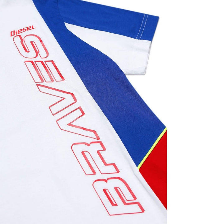 White and blue T-shirt for boys by Diesel, made in soft cotton jersey. There are red and neon yellow reflective trims, as well as a red 'Braves' logo print on the front.