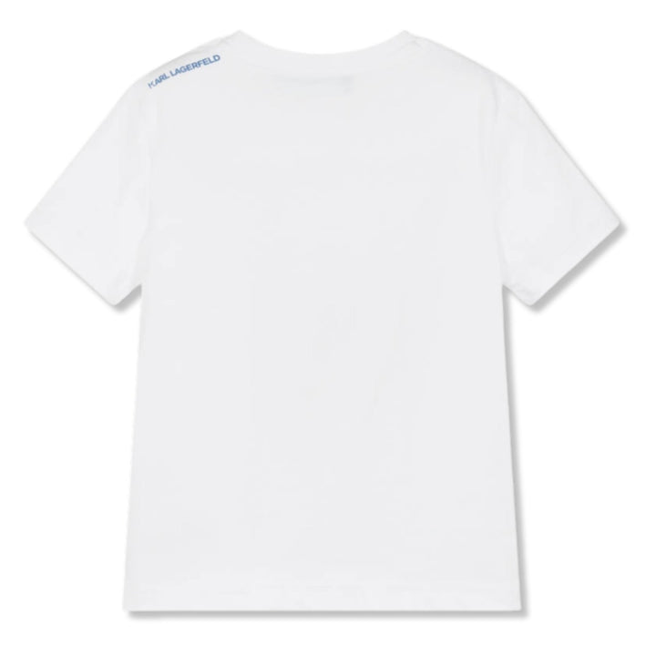 Boys white T-shirt by KARL LAGERFELD KIDS, made from soft, breathable organic cotton jersey. This classic piece showcases a modern and playful design, featuring an abstract logo and a blue Karl Ikonic outline. The comfortable fit is ideal for casual outings and a further logo print on the back completes this effortlessly cool look.