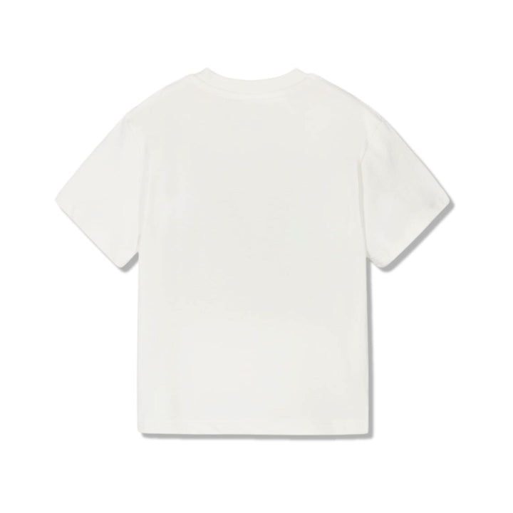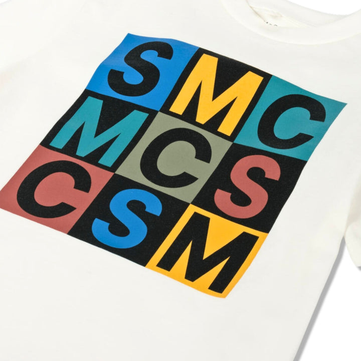 White organic cotton T-shirt for boys by British brand Stella McCartney Kids, with a large, colourful box logo printed on the front for instant brand recognition. Ideal for relaxed, casual days, this short-sleeved T-shirt is made in soft, comfortable
