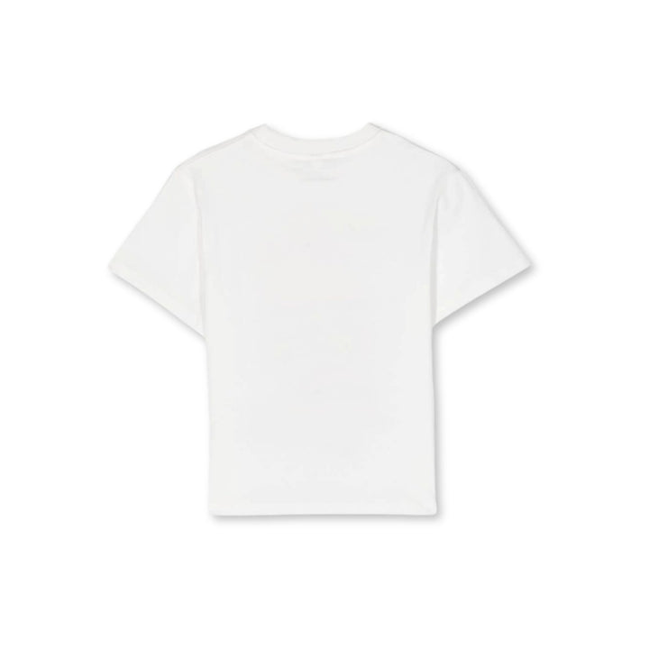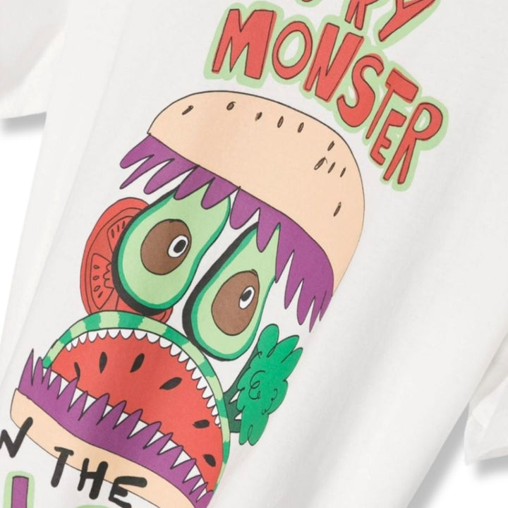 White T-shirt for boys by Stella McCartney Kids, made in soft organic cotton jersey. This casual tee has a playful burger character on the front, with a fun 'Hangry Monster' slogan. Styled with a lightly ribbed crew neck and short sleeves, it is idea