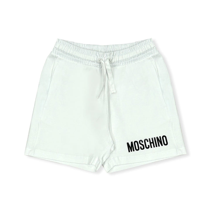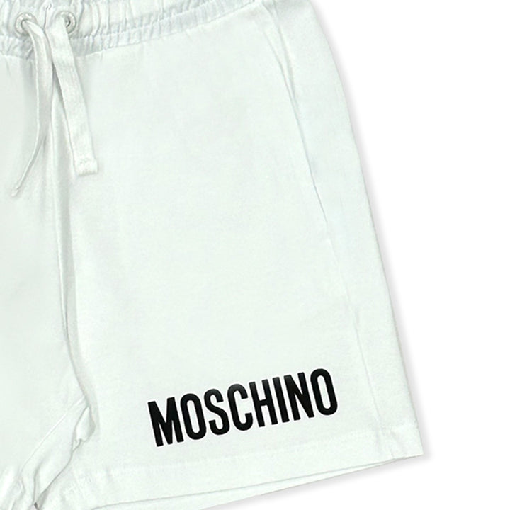 Boys white shorts by luxury Italian brand Moschino Kid-Teen, made in soft and comfortable cotton jersey. A black logo is printed on one side, giving this casual wear an elevated designer finishing touch. Easy to pull on, they have an elasticated draw