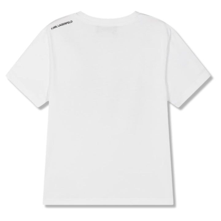 White Mini-me T-shirt for boys by KARL LAGERFELD KIDS, made in soft cotton jersey. This casual tee has a contrast black pocket on the chest with a Karl Ikonik graphic print.