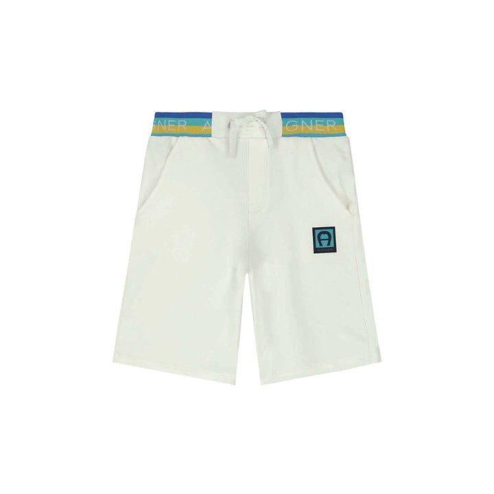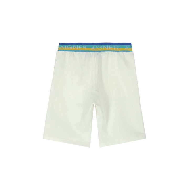 White casual shorts for boys by AIGNER, made from soft and comfortable cotton jersey, with a rubberised holographic signature 'A' horseshoe logo on the front. They have a stretchy blue and yellow stripe logo waistband, faux drawstrings and slanted fr
