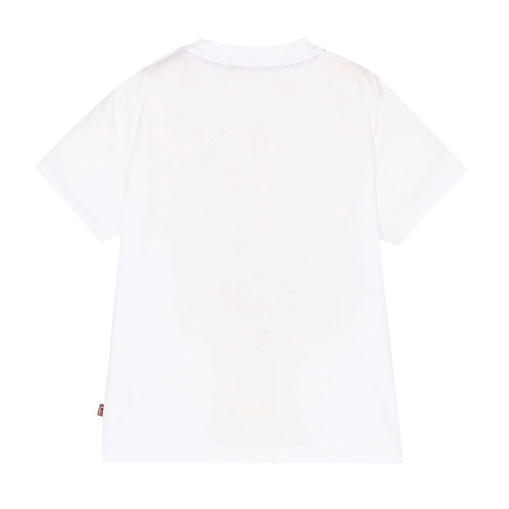 Boys white T-shirt by AIGNER, made in soft cotton jersey with a rubberised logo patch on the chest. It has yellow and beige patterned stripes on the front, with the brand's signature 'A' horseshoe logo. There are useful popper fastenings on one shoul