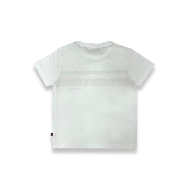 A white T-shirt for boys by AIGNER, made from super soft cotton jersey. There is a bright blue panel across the front, printed with the brand's signature 'A' horseshoe logo for a striking look. There is an embroidered logo beneath to finish this casu