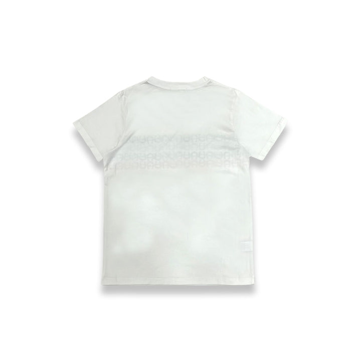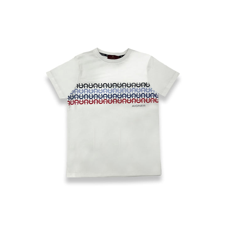 A white T-shirt for boys by AIGNER, made from super soft cotton jersey. There is a bright blue panel across the front, printed with the brand's signature 'A' horseshoe logo for a striking look. There is an embroidered logo beneath to finish this casu