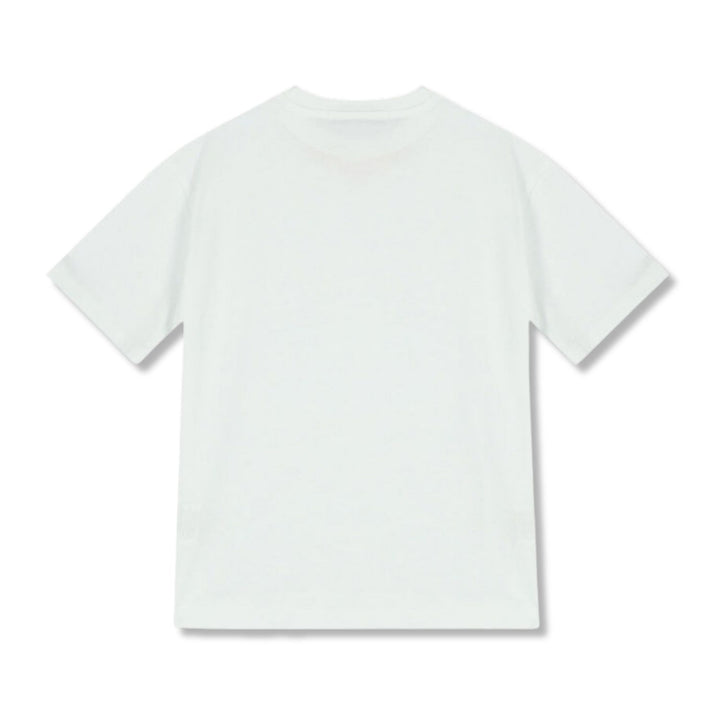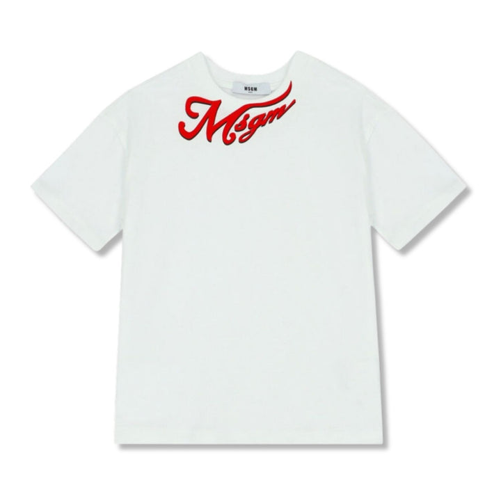 White T-shirt for boys by Italian brand MSGM, made in soft cotton jersey. Stylish and versatile, it has a flocked red logo print on the chest and a fabric logo tab above the hemline.