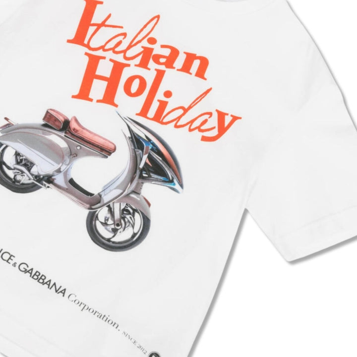 Cool white, Mini-me T-shirt for boys by luxury Italian label, Dolce & Gabbana, made in soft cotton jersey. This relaxed-fit tee, has 'Italian Holiday' printed in red above a stylish Vespa for an eye-catching look. A logo is printed above the hem to c