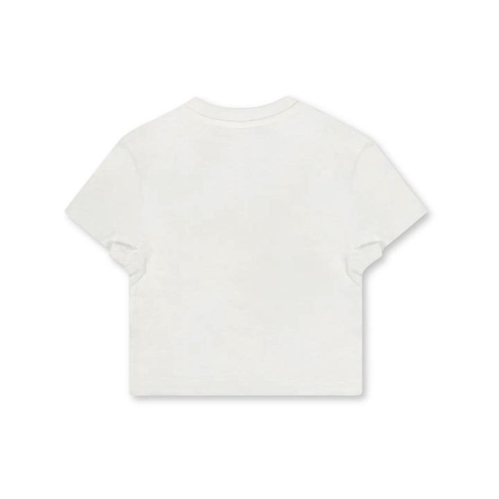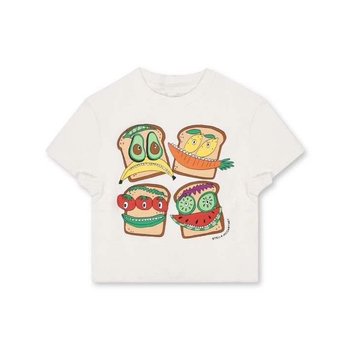 White short-sleeved T-shirt for boys by British brand Stella McCartney Kids, with a quirky sandwich and logo print on the front. Made in soft, comfortable, organic cotton jersey, it is just right for casual days. The Stella McCartney fit can be quite