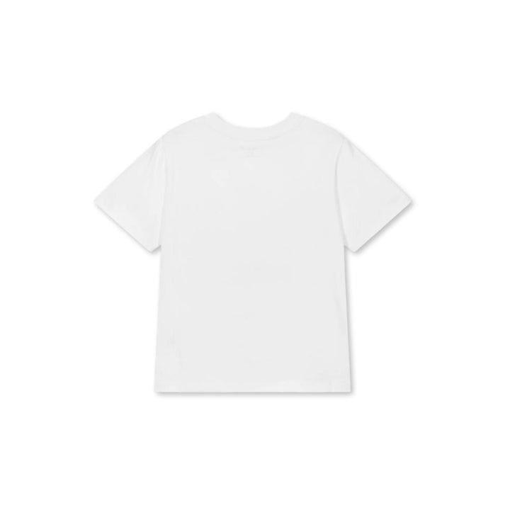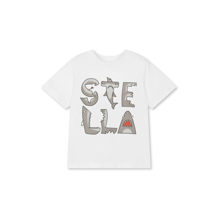 A cool white short-sleeved T-shirt for boys by Stella McCartney Kids, made from soft organic cotton jersey. Casual and comfortable, it has a classic crew neck and a playful grey shark logo graphic on the front. The Stella McCartney fit can be quite s