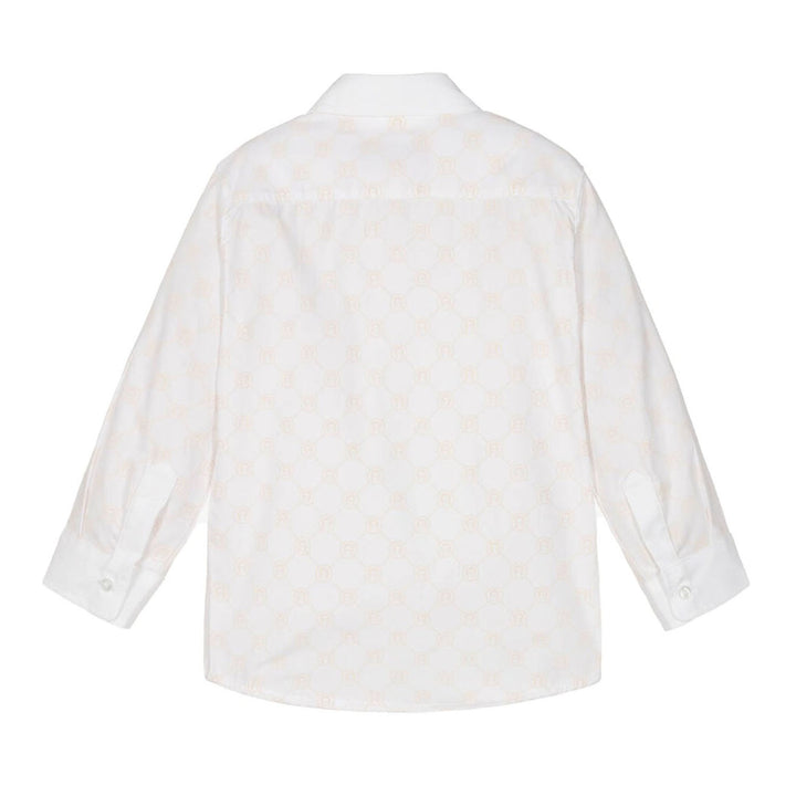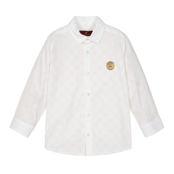 White shirt for boys by AIGNER, made from lightweight and breathable cotton. Subtly printed with an all-over monogram pattern in beige, this shirt has the House's signature 'A' horseshoe logo in gold on the chest. The branded front button fastenings
