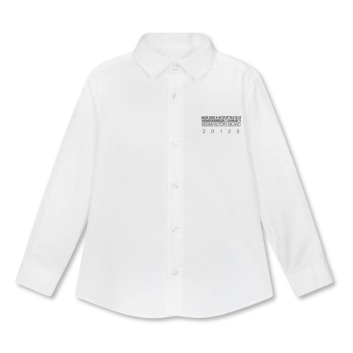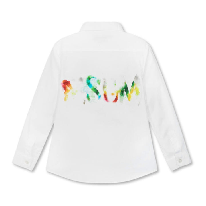 A white shirt for boys by Italian brand MSGM, made in soft cotton poplin. This classically styled long-sleeved shirt has a pointed collar and fastens with branded buttons. For a signature look, it features a colourful watercolour-inspired logo graphi