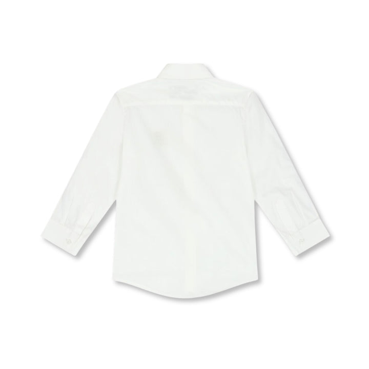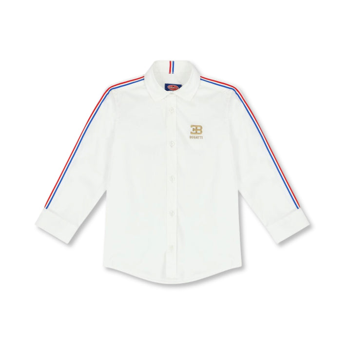 White logo shirt for boys by Bugatti Junior. Made from soft cotton jersey. Features a embroidered brand logo in metallic gold on the chest. It has blue, white and red striped trim. Collared neck with button down closure and long sleeves with buttoned