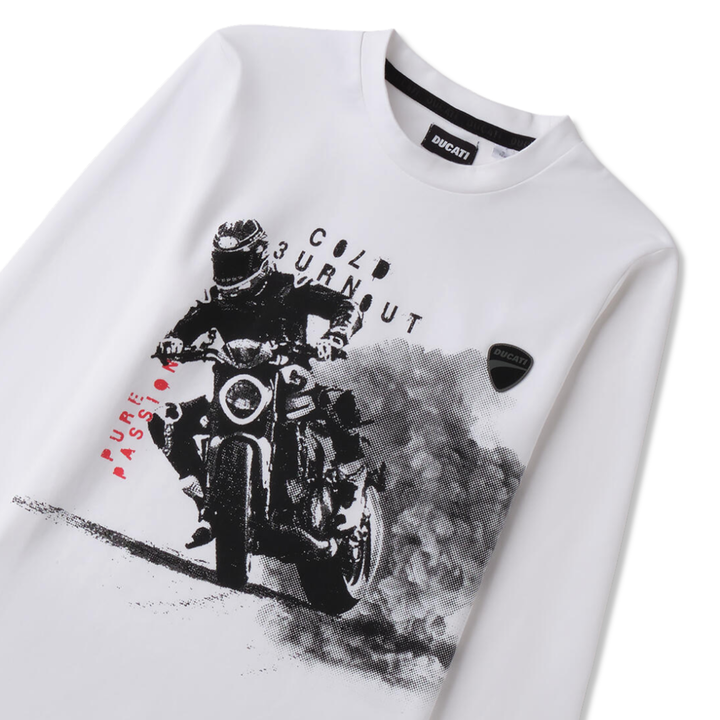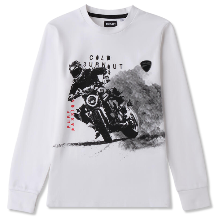 This Boys White Graphic-Print T-Shirt by Ducati combines soft cotton comfort with a bold graphic design, creating a fresh and stylish look for everyday wear.