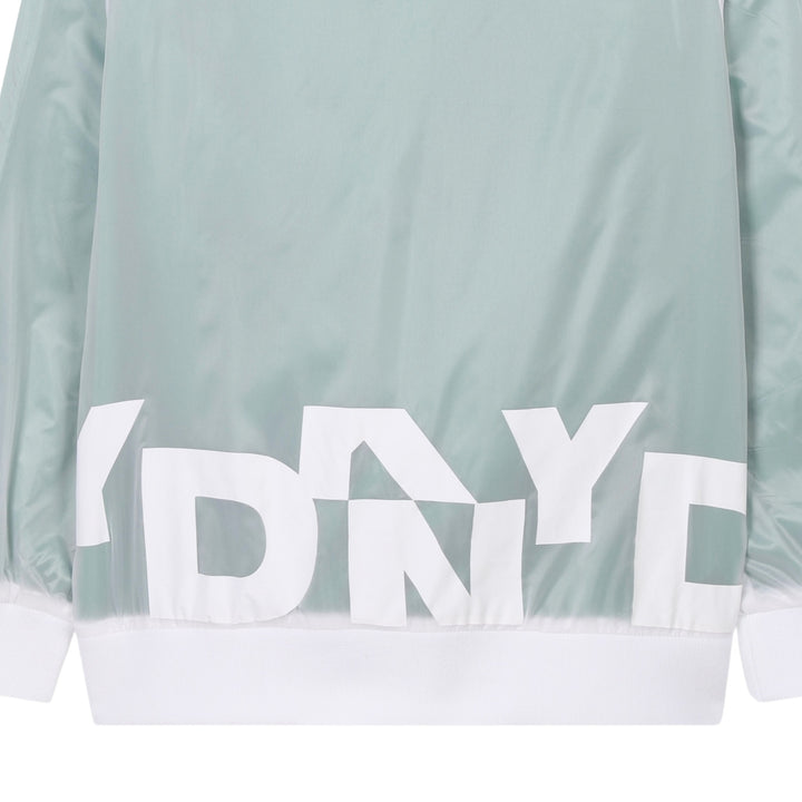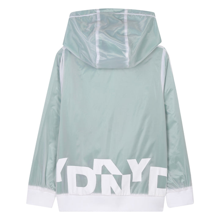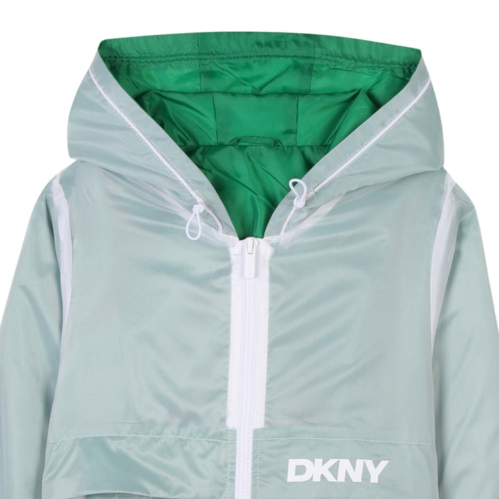 This stylish DKNY windbreaker jacket features a sleek, modern design with a light mint green exterior and contrasting white and green inner lining. The lightweight, water-resistant fabric makes it perfect for transitional weather, while the zip-up fr