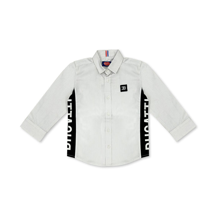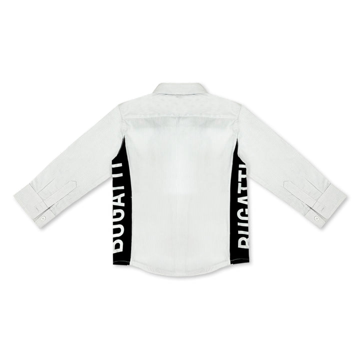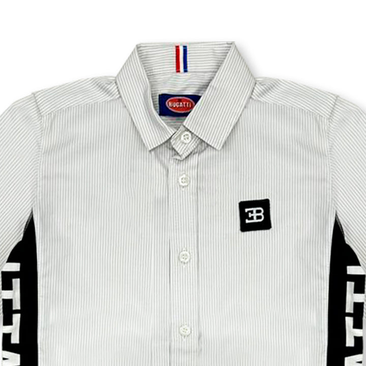 Boys white & grey logo shirt by Bugatti Kids. Made from soft cotton, it features a stripped print pattern and logo badge on the side . Collared neck with button down closure and long sleeves.