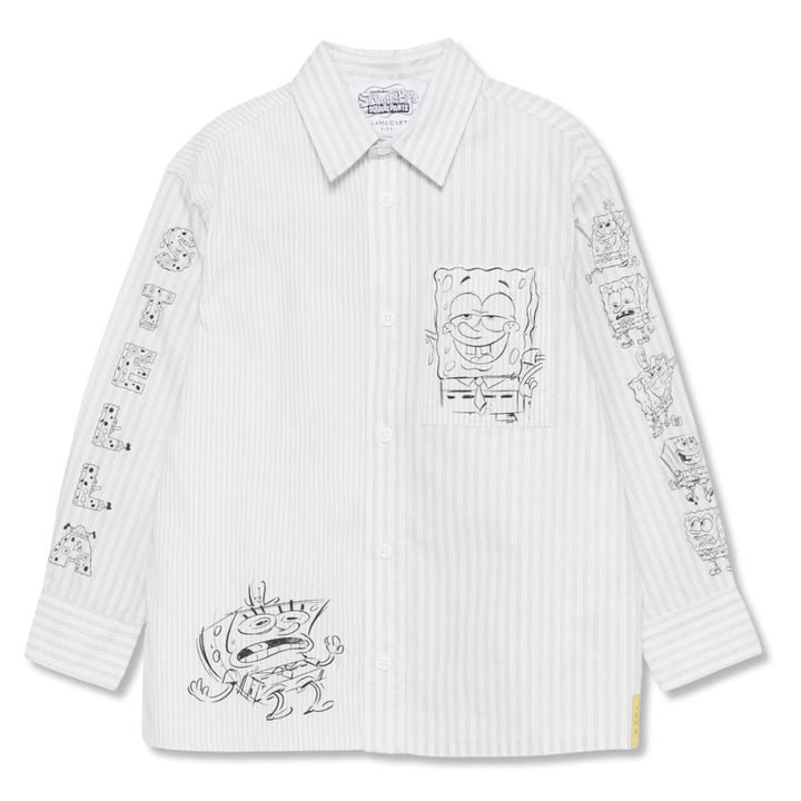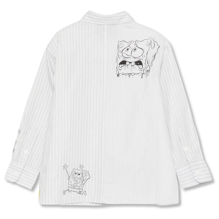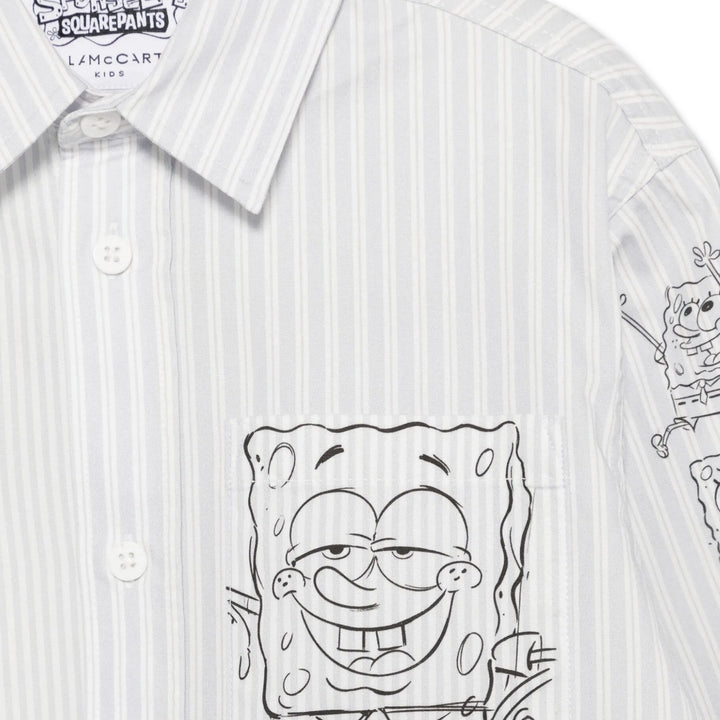 Light blue Stella McCartney Kids x SpongeBob striped shirt with a front button fastening, chest patch pocket, long sleeves, and buttoned cuffs. Playful and stylish for any occasion.