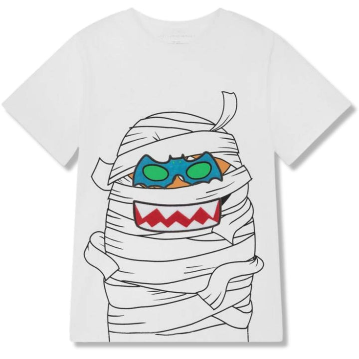 White T-shirt for boys by Stella McCartney Kids, made in soft cotton jersey. This Halloween-themed design features a playful mummy design on the front, with fun interactive patches that attach with velcro.