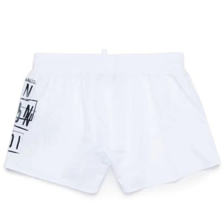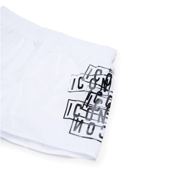 Polyester boxer swim shorts. Mid-length. Drawstring waist. Features a displaced effect Dsquared2 Icon print on the front. A cool option for summer occasions.