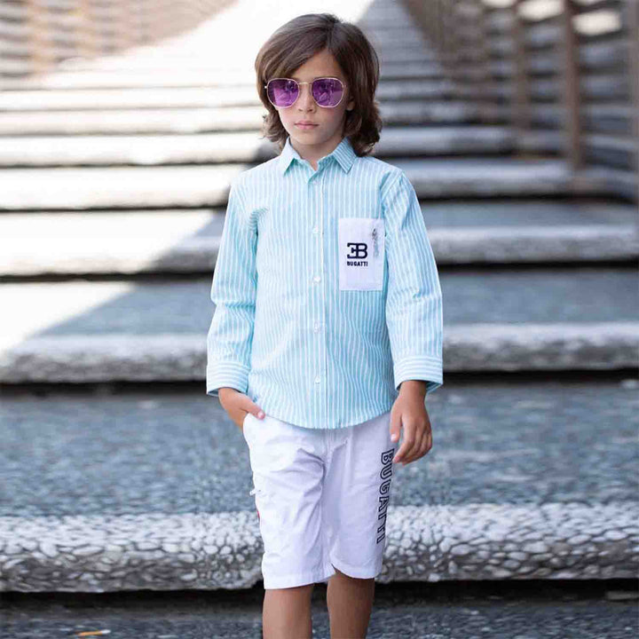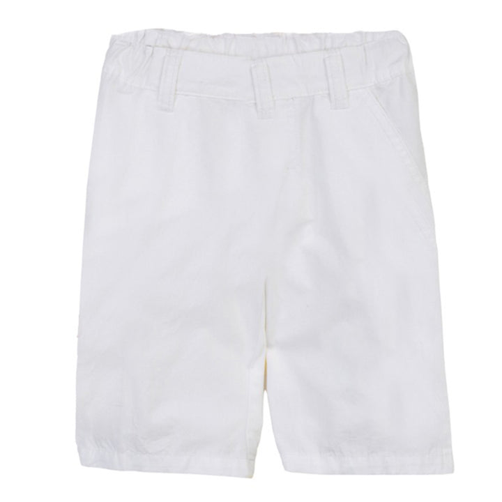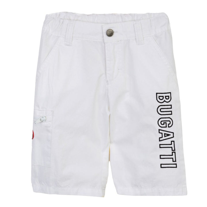 White logo shorts for boys by Bugatti Junior. Made from soft cotton, it features the brands logo rubber badge on one leg and it has dual side pocket. An logo elasticated waistband and drawstring for comfortable fit.