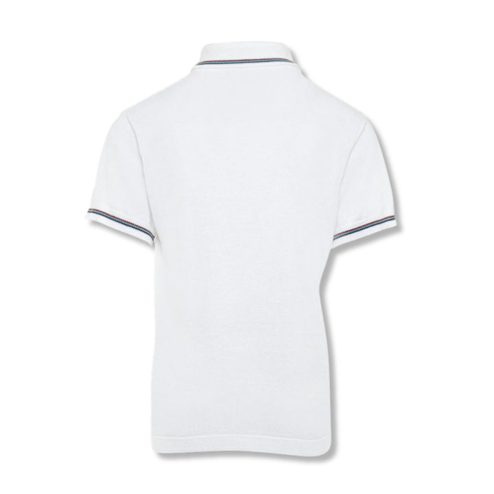 White knitted cotton polo shirt for boys by Italian luxury fashion house Missoni. Lightweight, comfortable and with a boxy fit, it has stripes on the collar and cuffs in brown and shades of blue, coordinating with the brand's iconic zigzag pattern on