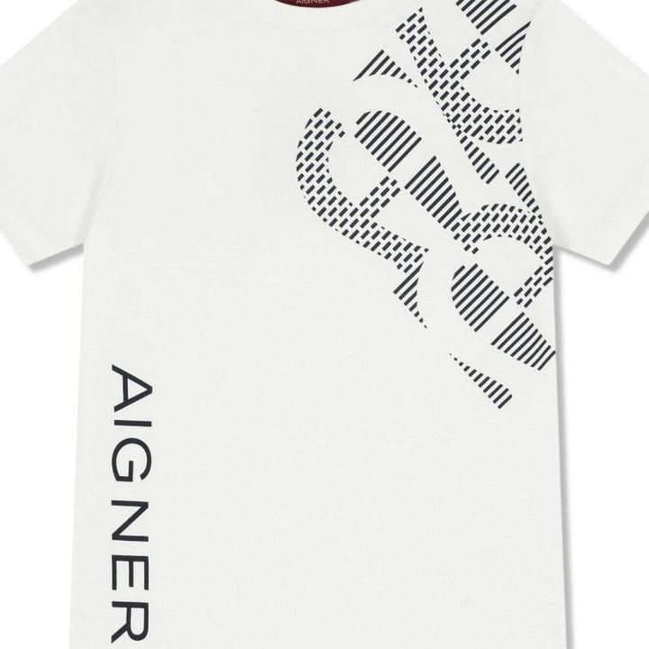 White t-shirt for boys by Aigner. Made from soft cotton jersey. It features the brands iconic horseshoe logo and brands name in navy blue print on the front.