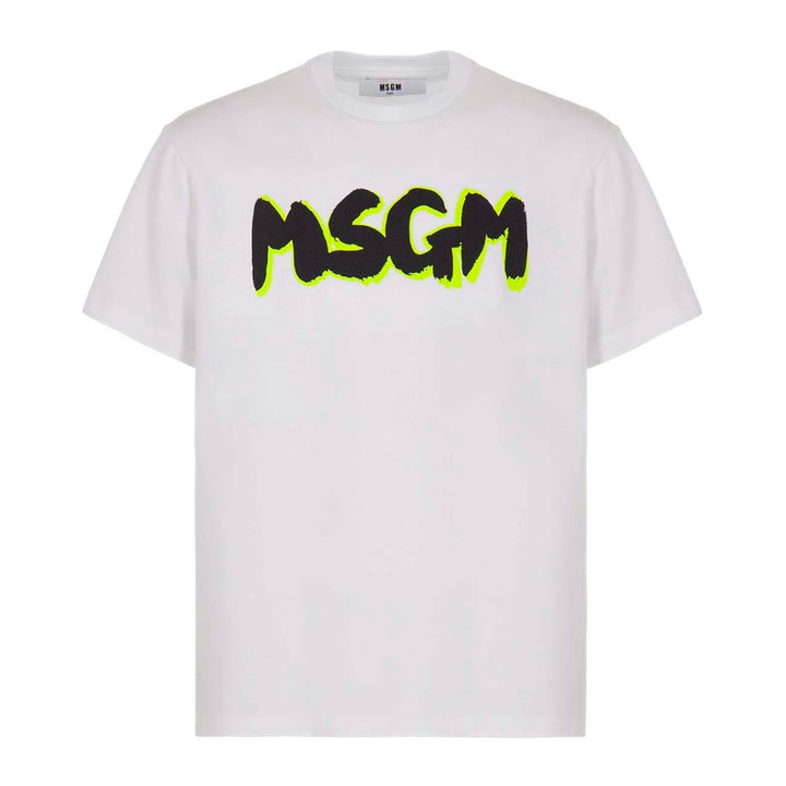 Cool white cotton crew-neck T-shirt for boys by Italian brand MSGM. This short-sleeved jersey tee has a brushed logo graphic in black and bright yellow for a bold streetwear look.