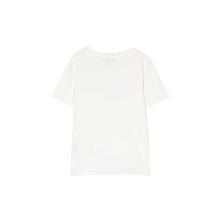 White logo-print cotton T-shirt from Balmain Kids featuring white-black, cotton, jersey knit, logo print to the front, crew neck, short sleeves and straight hem.