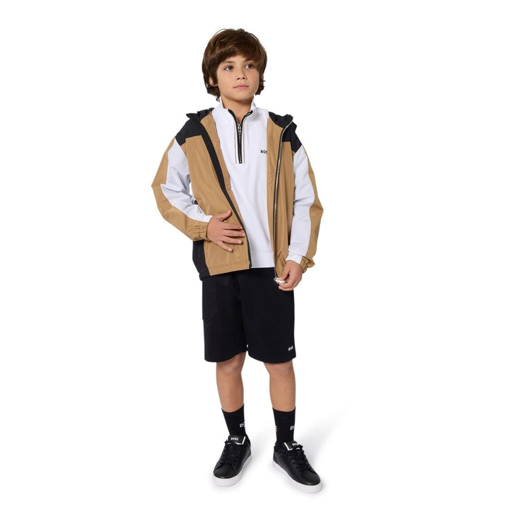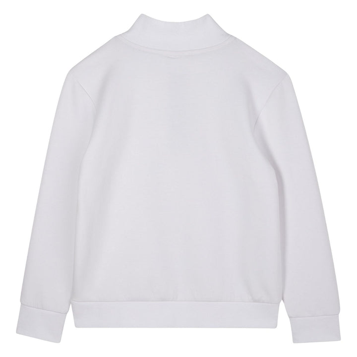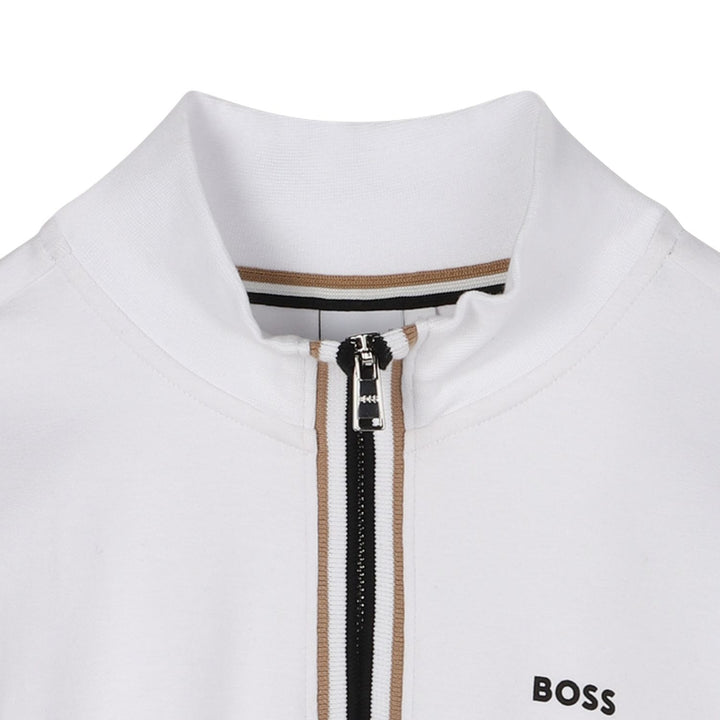 White sweatshirt for boys by BOSS. Made from soft cotton, it features the brands logo print on the chest. Fastens with half zip and it has the brands signature striped in beige, white and black.