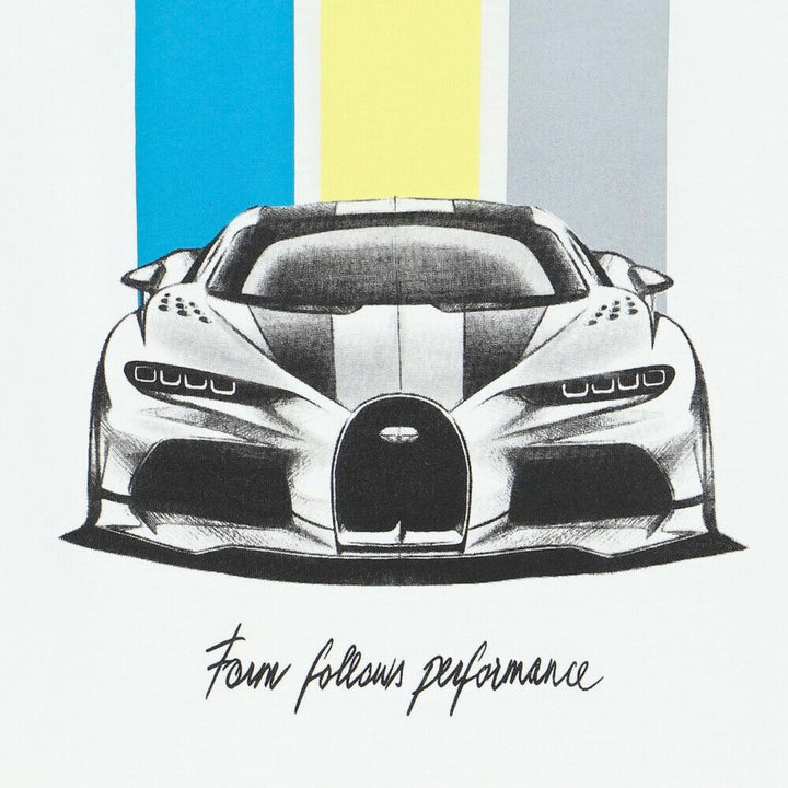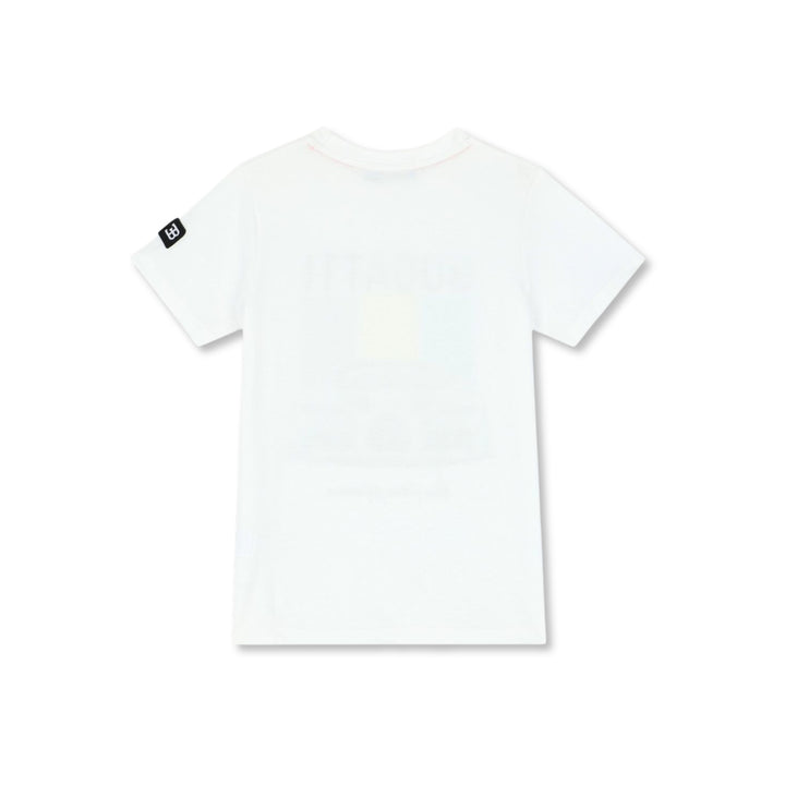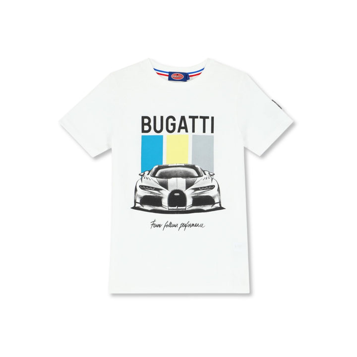 White logo t-shirt for boys by Bugatti Junior. Made from soft cotton jersey. Features the sports car and brand logo in white on the front. It has slogan print and blue, yellow and grey trims on the front.