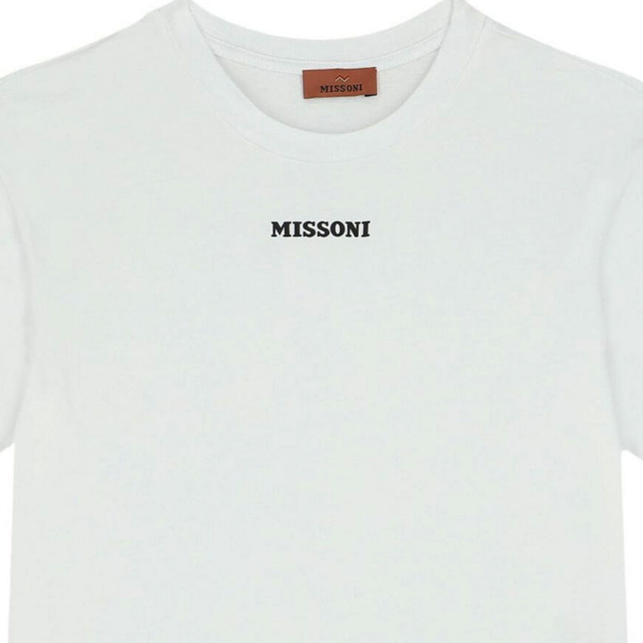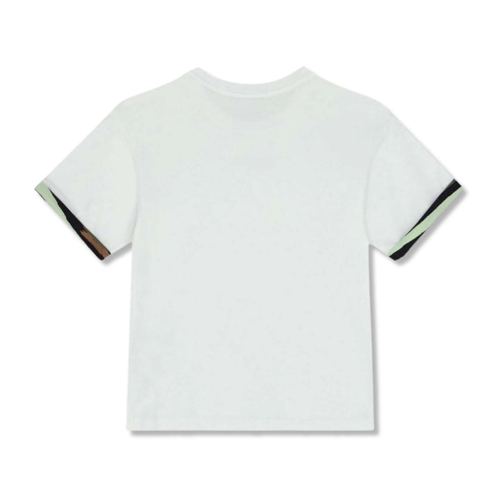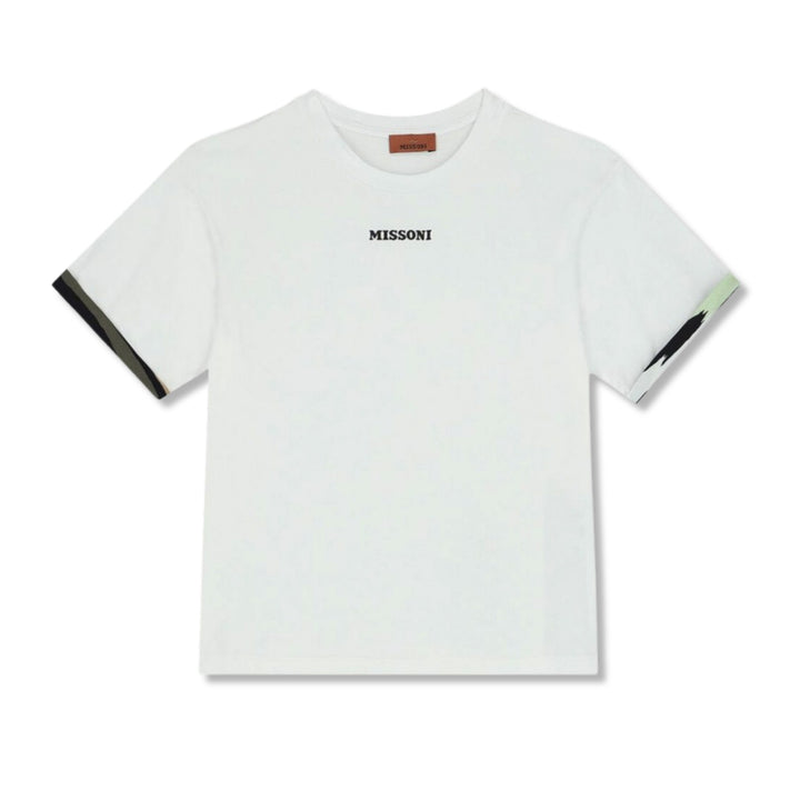 White t-shirt logo for boys by Missoni. Made from soft cotton jersey. Featuring the black rubberized logo on the front and it has a short sleeve with camouflage printed on the roll up.