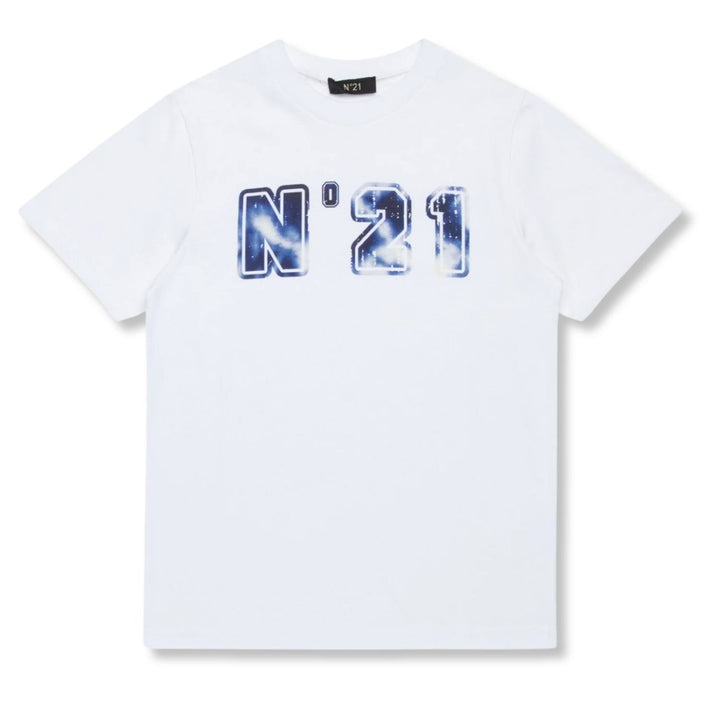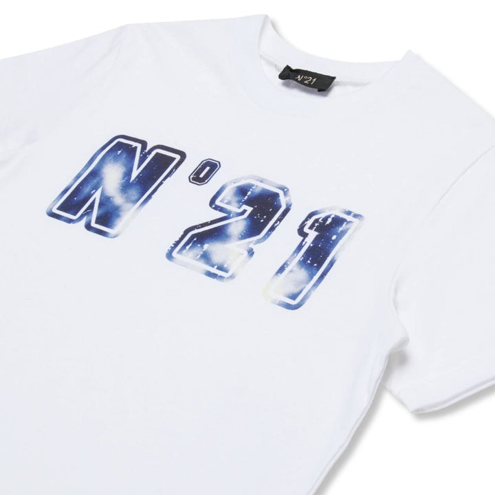 Boys White Logo-Print T-Shirt by N21 featuring a classic fit and bold front logo a stylish staple for everyday wear.