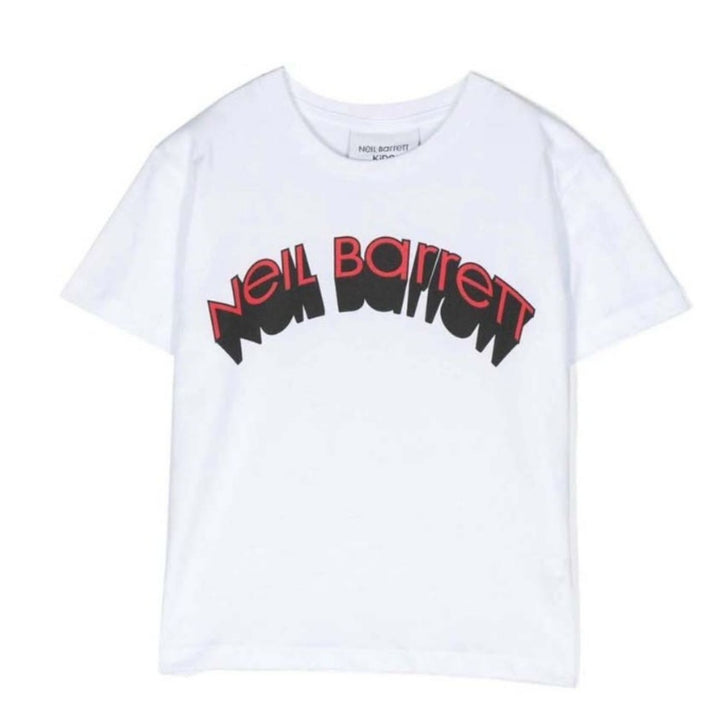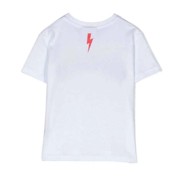 Boys White Logo T-Shirt By Neil Barrett. Made From Soft Cotton, It Features A Signature Thunderbolt And Smiley Print In Black And White Respectively On The Front And It Has A Logo Print At The Back Neck.