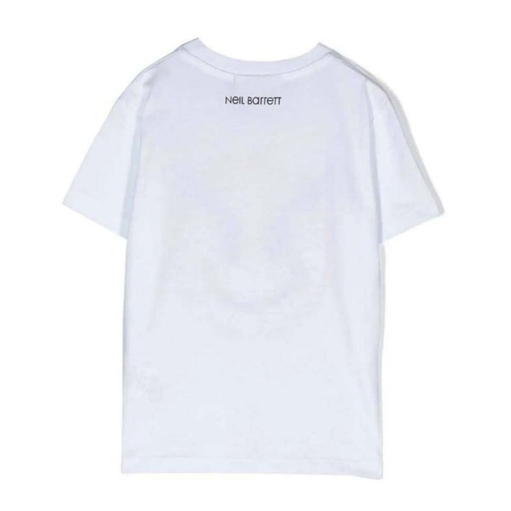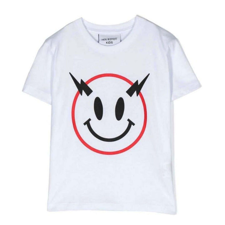 Boys White Logo T-Shirt By Neil Barrett. Made From Soft Cotton, It Features A Signature Thunderbolt And Smiley Print In Black And White Respectively On The Front And It Has A Logo Print At The Back Neck.