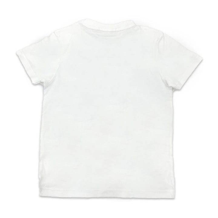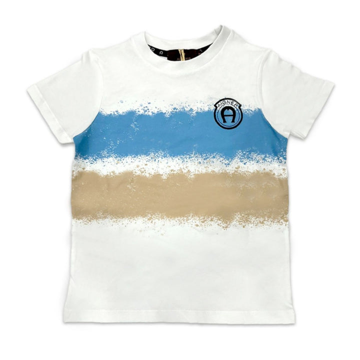 White logo t-shirt for boys by German designer Aigner. Made from soft cotton, it features a blue and beige paint design across the front and it has brands iconic horseshoe logo embroidered in navy on one side.