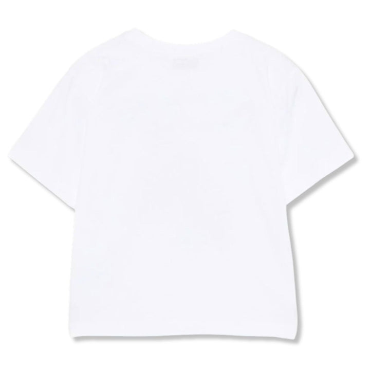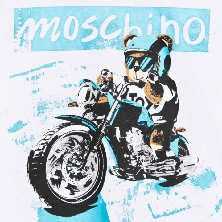 White cotton T-shirt for boys by Moschino, made in comfortable jersey. This logo tee has a lightly ribbed crew neck and an oversized silhouette. It has a cool motorbike graphic on the front, featuring the Moschino Teddy Bear with metallic silver acce